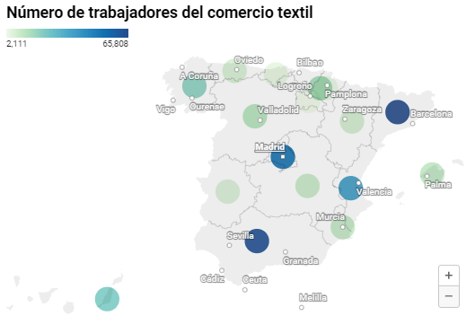 El subsector del comercio de textiles acumula 30.467 afiliados a la seguridad social (17.213 personas bajo el régimen general y hasta 13.254 cómo autónomos), mientras que la venta al por menor de artículos de relojería y joyería emplea a un total de 22.483 personas (con 13.906 de ellas bajo el régimen general y otros 8.577 autónomos).